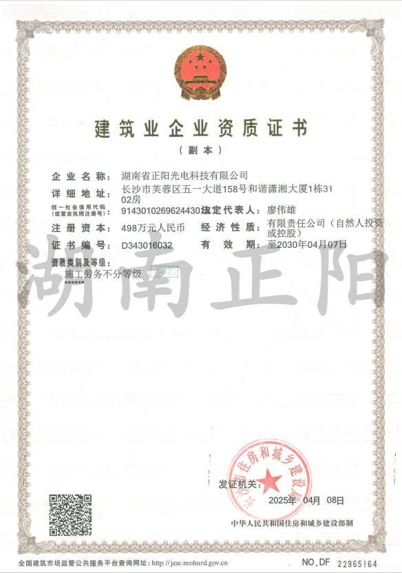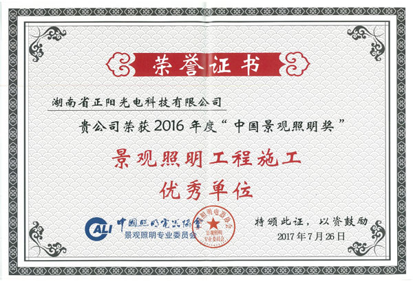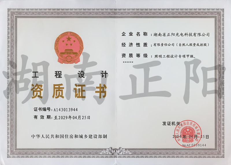 湖南省正陽(yáng)光電科技有限公司是一家從事亮化工程及大型燈光藝術(shù)的設(shè)計(jì)、制作、安裝和維護(hù)于一體的專(zhuān)業(yè)化公司。公司資質(zhì)齊全、管理嚴(yán)謹(jǐn)、技術(shù)先進(jìn)、實(shí)力雄厚,取得了城市及道路照明工程專(zhuān)業(yè)承包壹級(jí)資質(zhì)、照明工程設(shè)計(jì)專(zhuān)項(xiàng)甲級(jí)資質(zhì)、機(jī)電工程施工總承包貳級(jí)資質(zhì)、施工勞務(wù)等資質(zhì)、國(guó)家高新技術(shù)企業(yè)、國(guó)家“重質(zhì)量·守誠(chéng)信”示范企業(yè)。